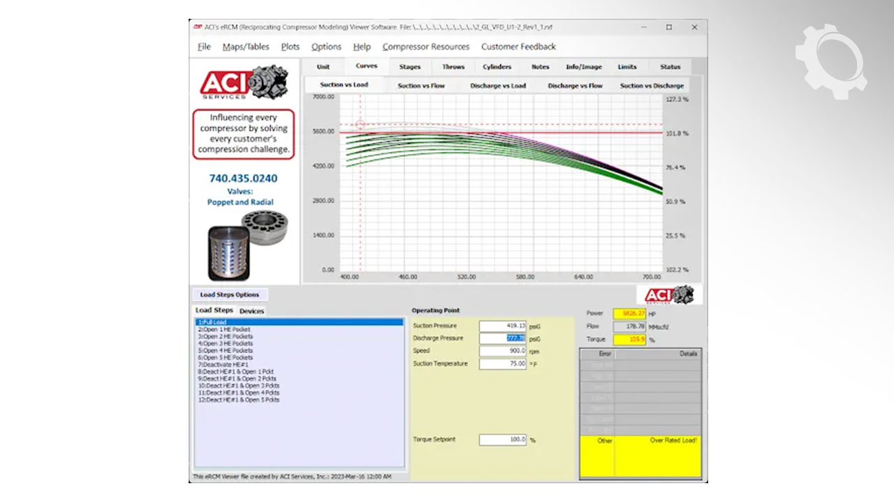This software provides the ideal solution to model compressor performance. It displays the unit’s performance curves: Pressure vs. Load, Pressure vs. Flow, Pressure vs. Pressure and more, including graphs of net rod load forces, PV/PT cards, Torque Effort, and more.