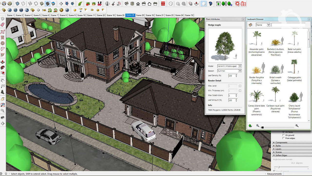 The Laubwerk Player is a plugin for Autodesk 3ds Max, Maya, MAXON Cinema 4D, Trimble SketchUp, or Sidefx Houdini that comes bundled with every Laubwerk Plants Kit. It loads the models and allows for easy selection and manipulation of the models, e.g., choosing between variations, ages, and seasons, and allows fine-grained control over the level of Detail. See the Laubwerk Player page for a more detailed description.